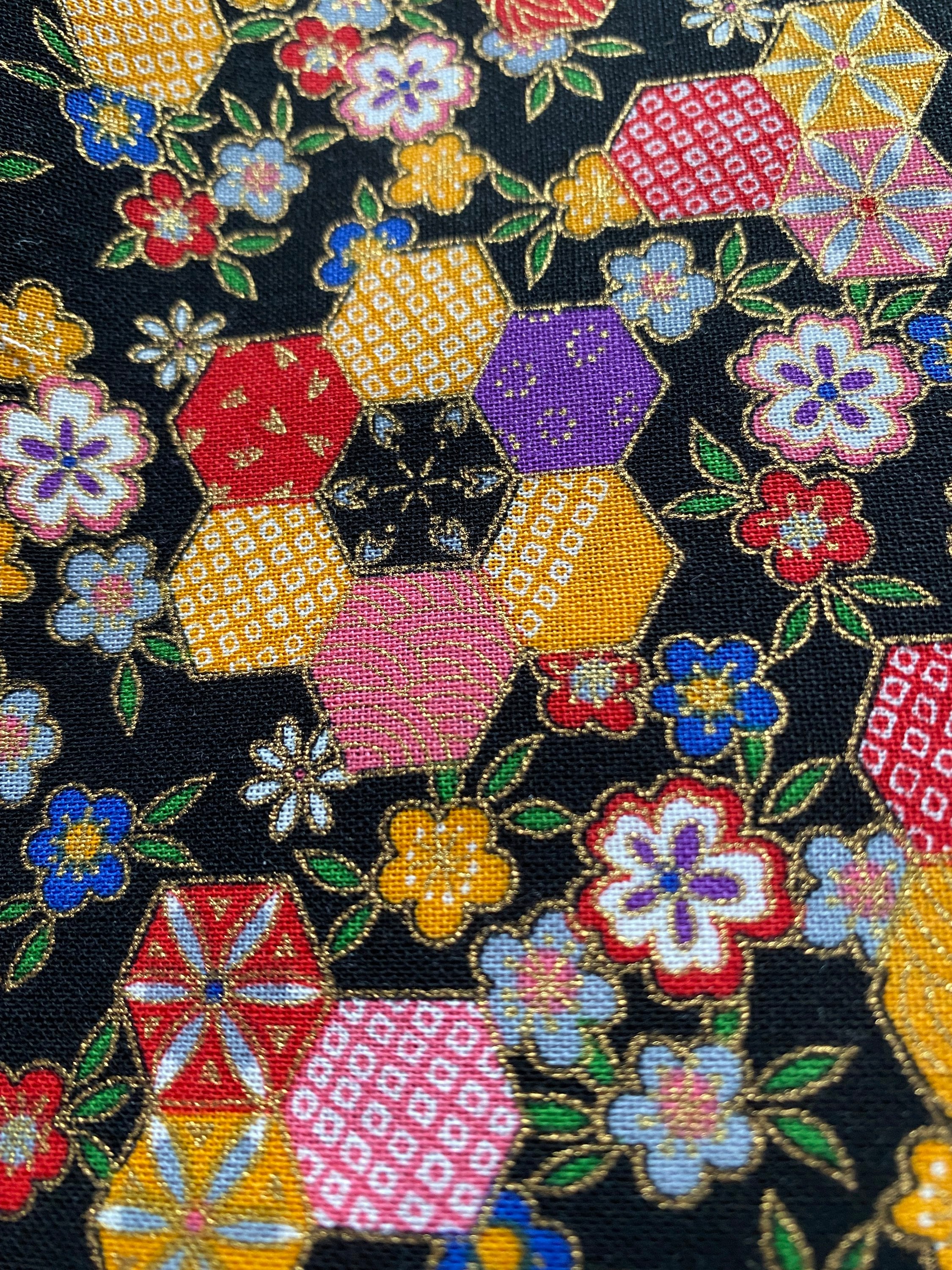 Hexagons ini a flower garden with gold highlights and a black background