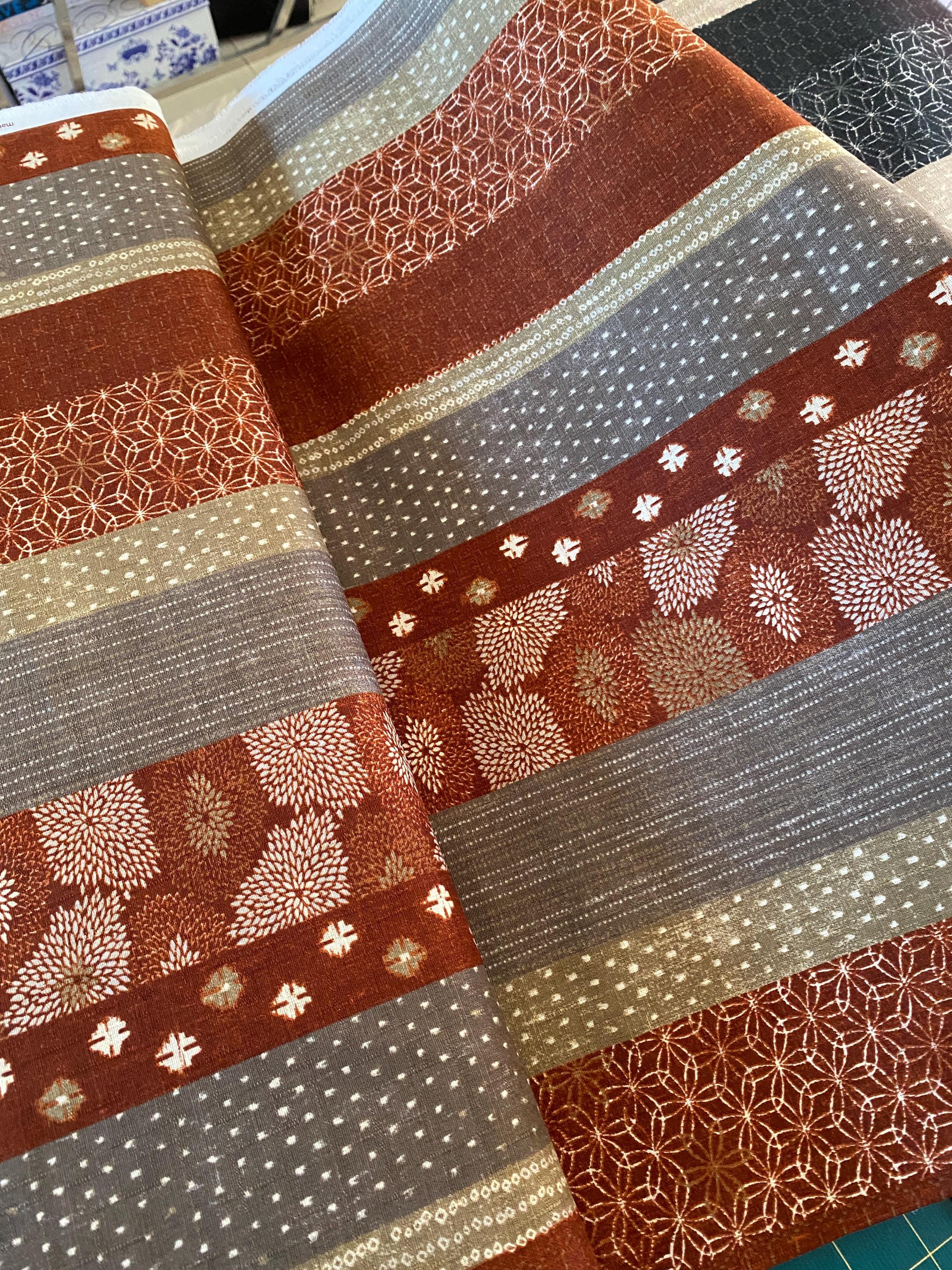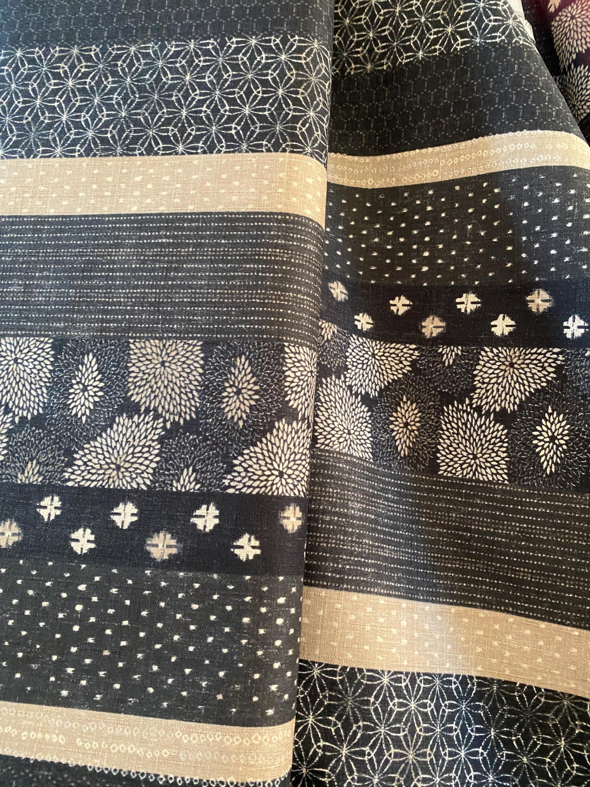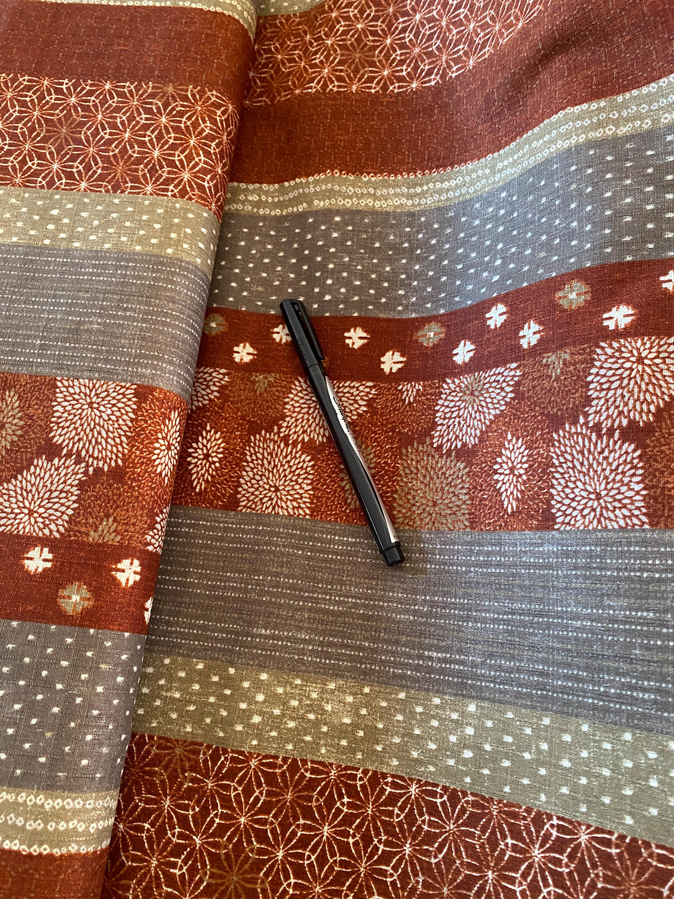 A beautifully Dobby Shantung cotton fabric with bands of traditional Japanese designs running down the length of the fabric.