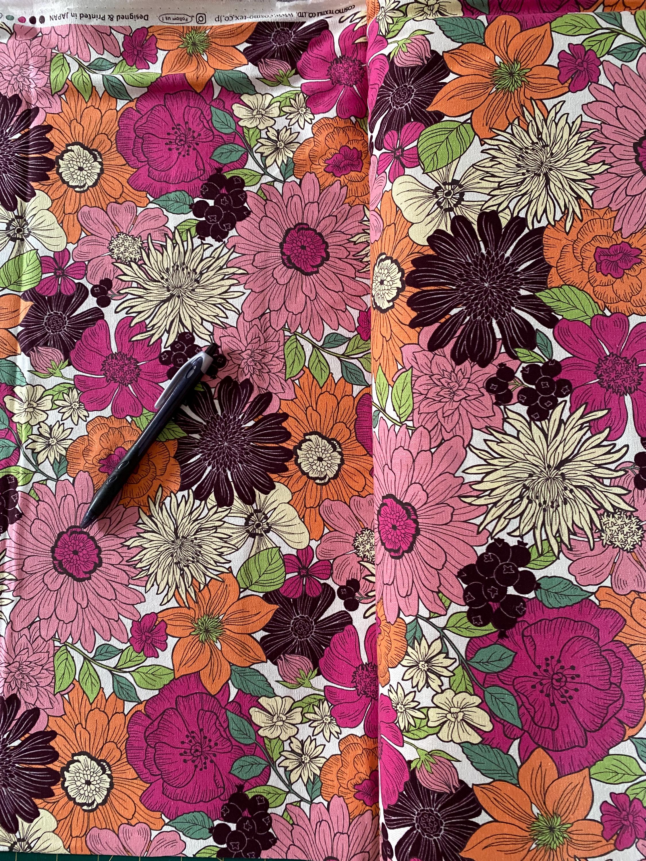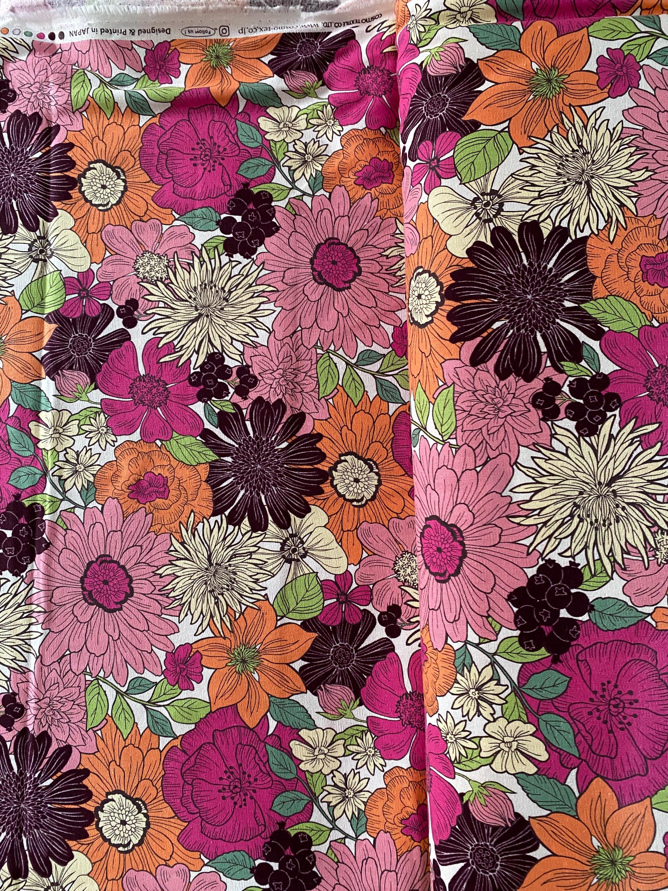 Genuine high quality Japanese Linen/Cotton fabric from Japan covered with large various flowers in Magenta, Pink, Orange & Cream on a neutral ecru background