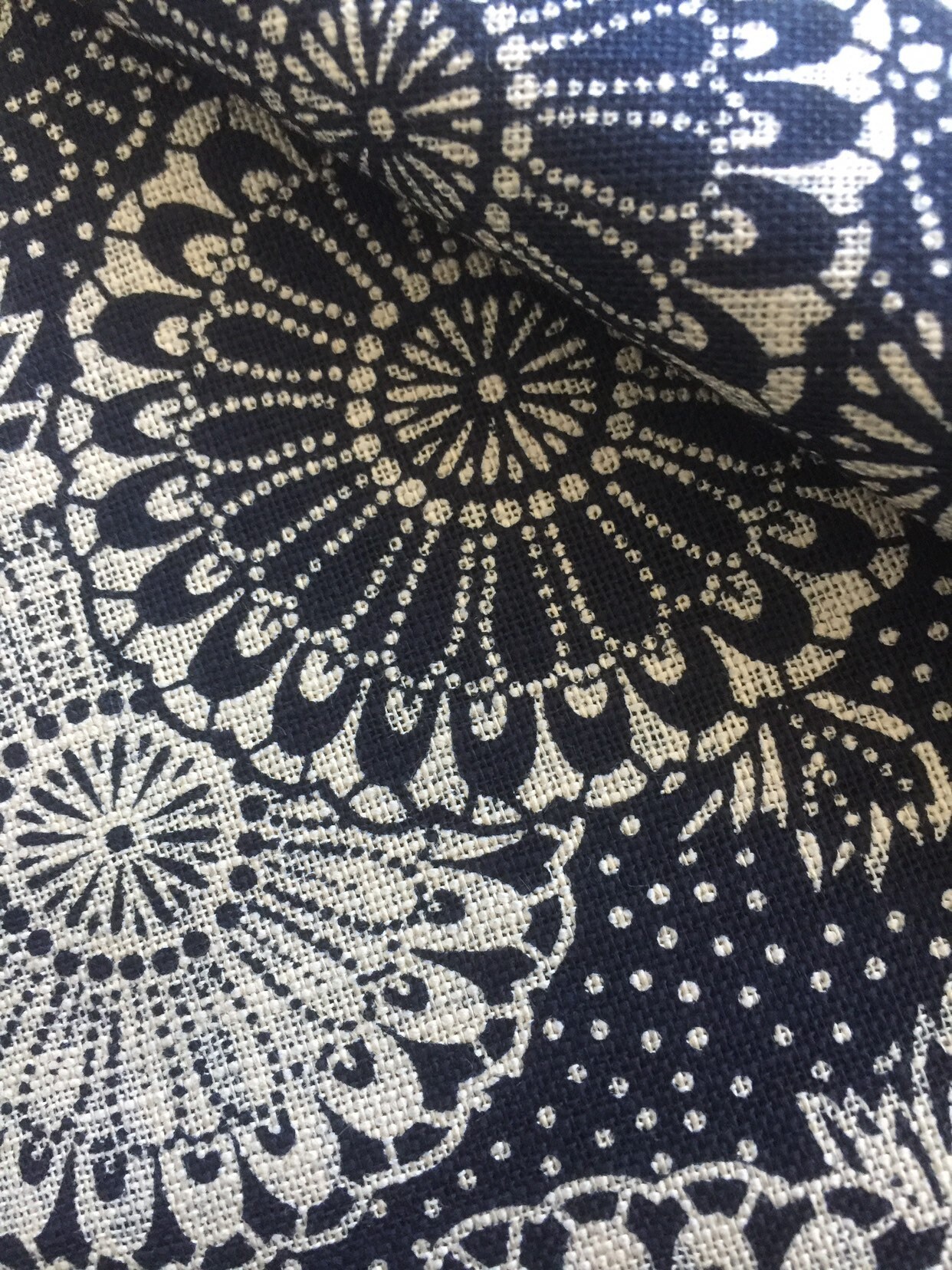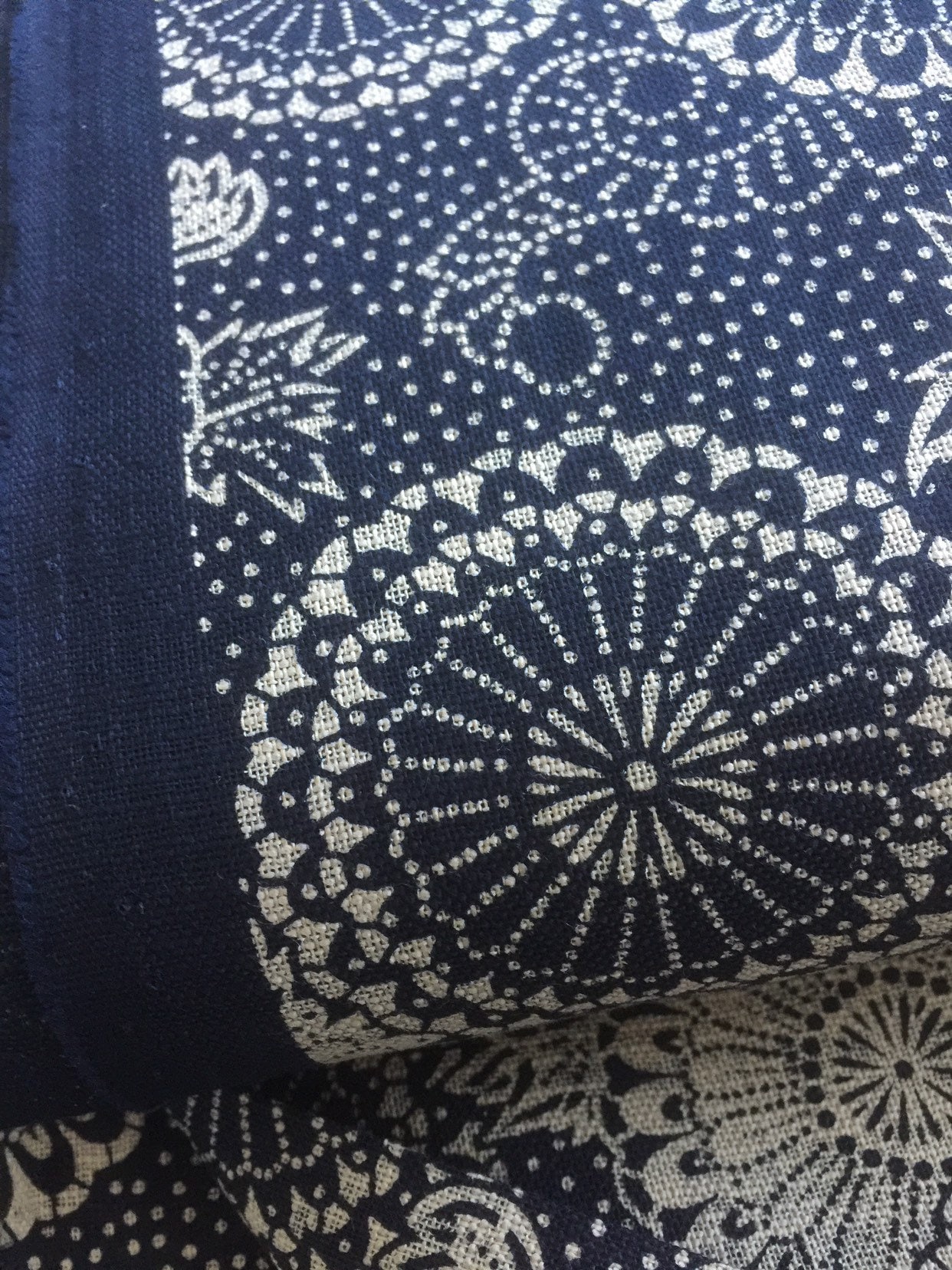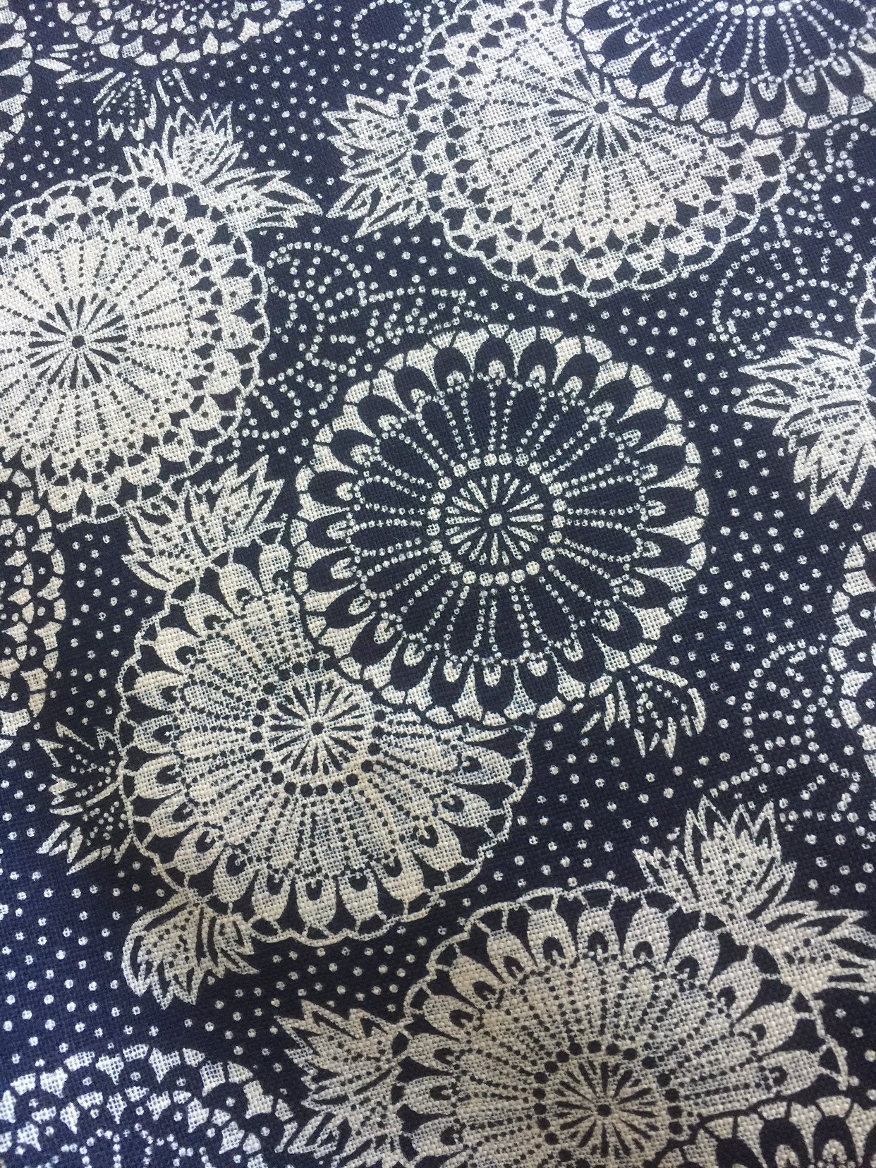 A heavy weight dark navy cotton by Sevenberry of Japan with stylized Dahlia flowers of dusky cream. Very stable cotton