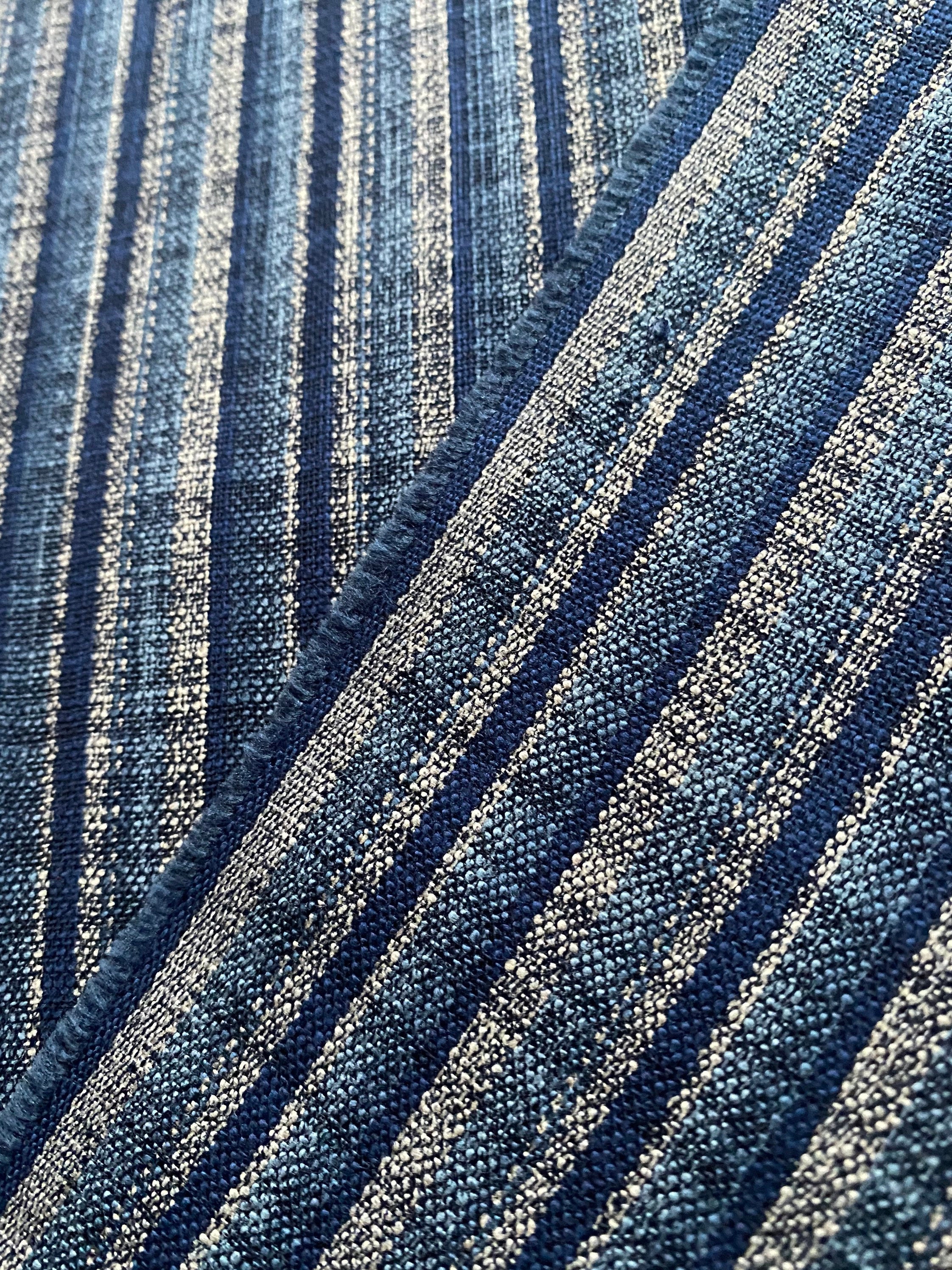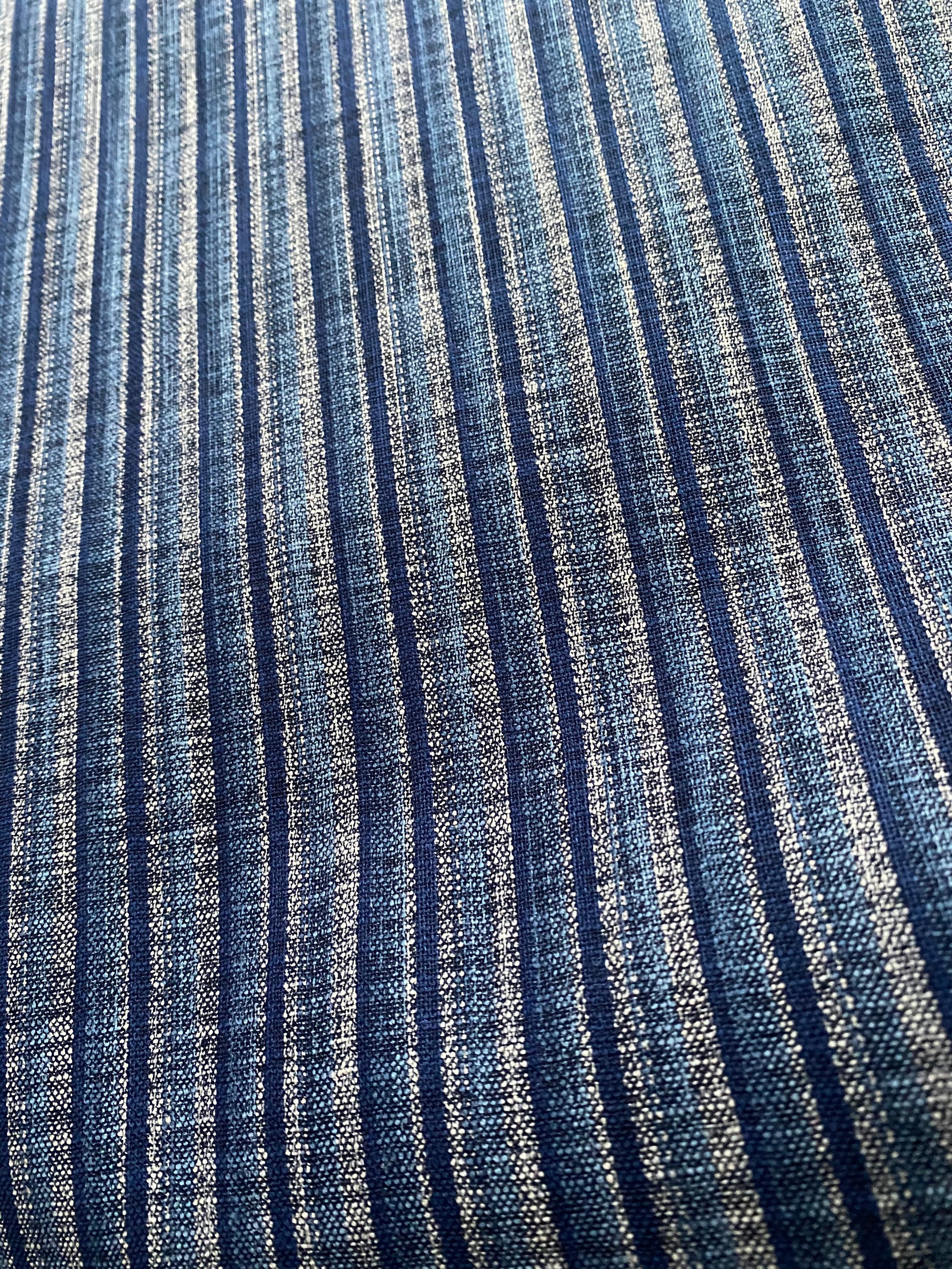 Printed striped fabric down the grain of the fabric. A beautiful fabric with various width narrow stripes in blue tonnings with a cream highlight stripe, a lighter colored stripe